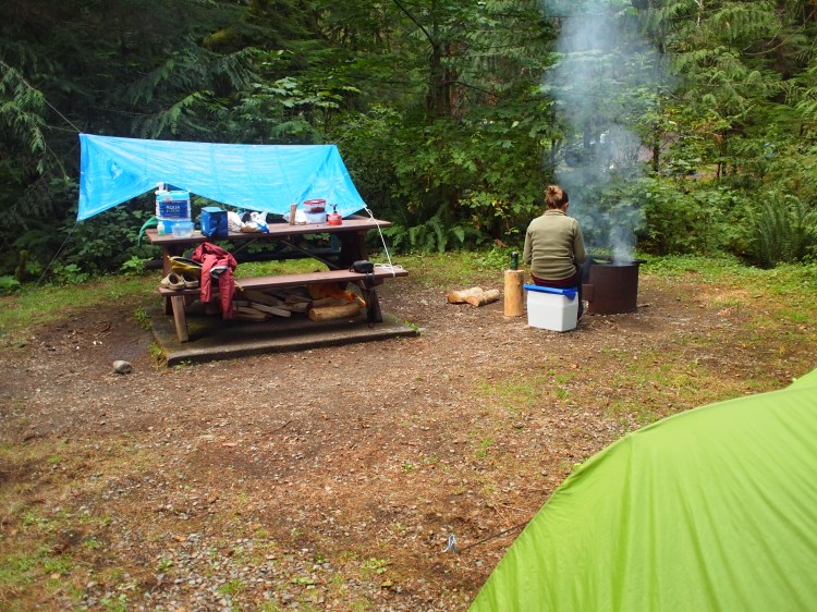 Our site (#10) was a bit too close to the outhouse for our liking, but otherwise fine. We could see two other sites through the trees but otherwise it was pretty private and got some late morning sun. The trees weren’t ideal for setting up a tarp, but we managed to at least cover the wood. It also didn’t rain!