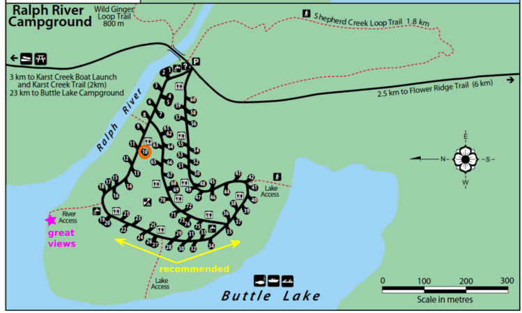 Map of Ralph River campground with recommended sites (yellow).