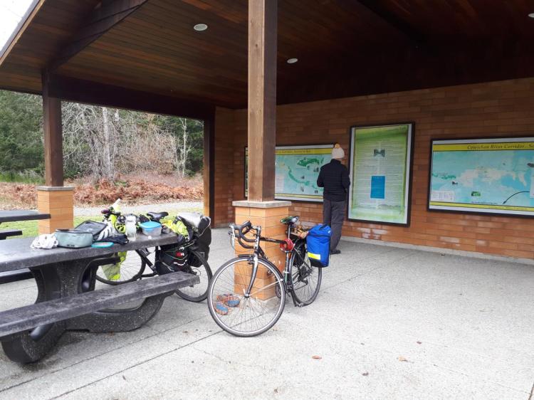 The part of the Cowichan Valley Trail that spans from Lake Cowichan to Duncan was definitely the best trail we biked on. It is quite wide, passes through a beautiful forest and feels flat, even through there was a 200m elevation change (mostly downhill for us). It was cold and rainy, so we only saw a couple other humans. We also saw two deer, that Adrien scared away with his bike bell.