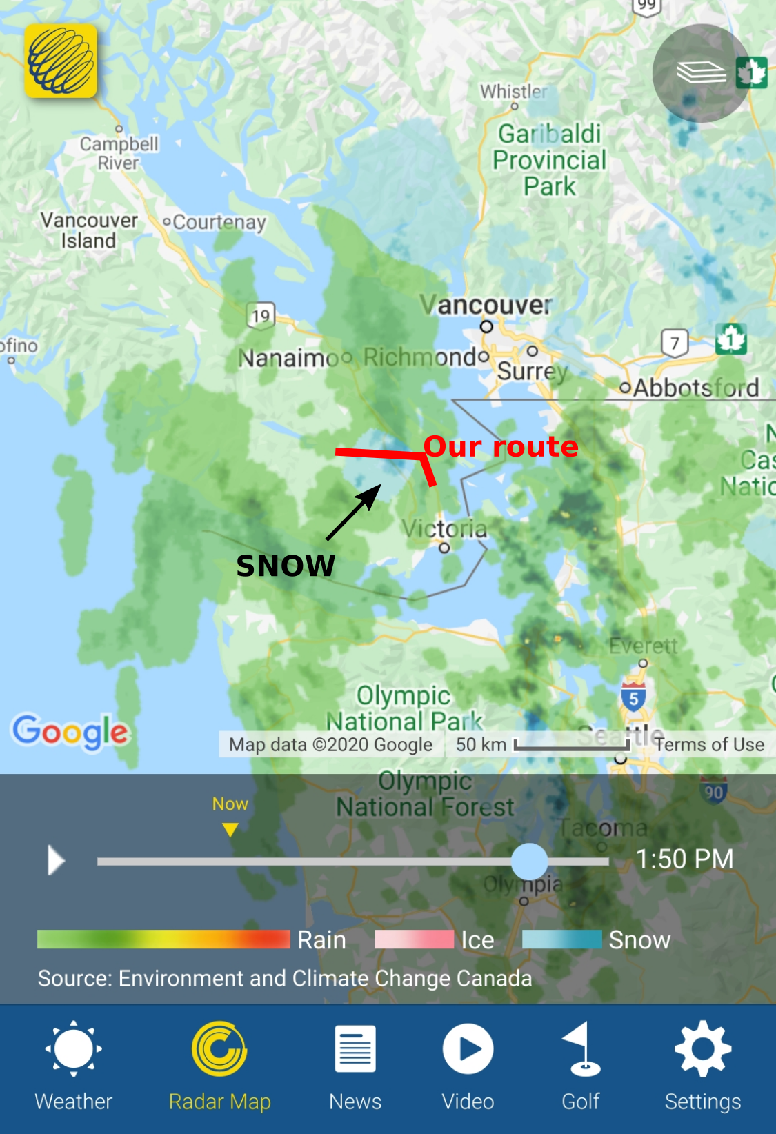 For this trip, Justine turned into a weather specialist, giving Adrien hourly updates on the oncoming rain, wind and even snow thanks to predictions and forecasts from Environment Canada, the Weather Network and Windy. Plans changed by the minute as we took advantage of any dry gap and tried to avoid the worst of the storms. In the end, we managed the weather pretty well, having only one ride in the rain and making it home before the 60 km/hr wind warning took effect.
