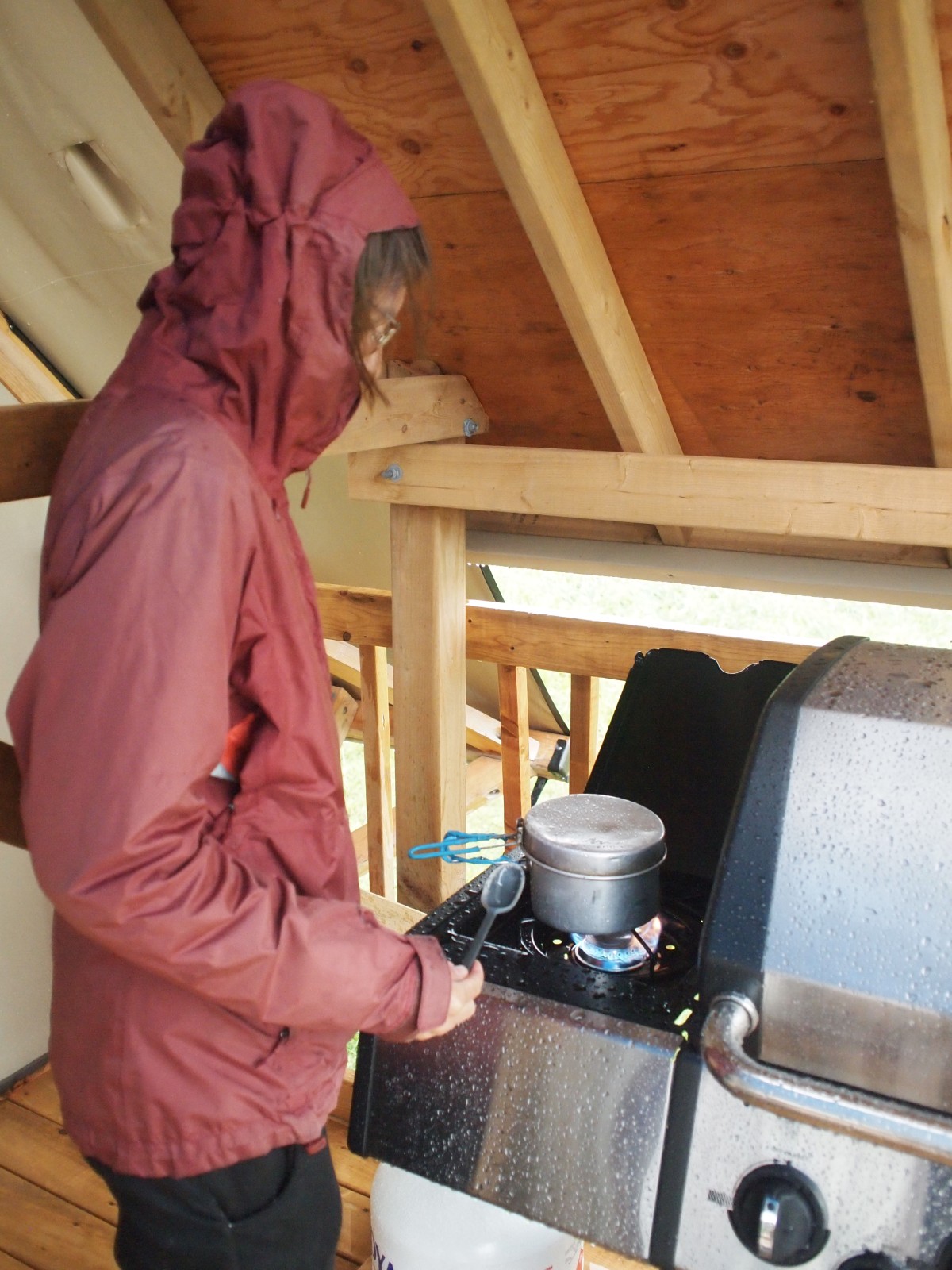 - For cooking, each oTENTik has a nice BBQ that includes a side burner, so you really don’t need to bring your own stove. In fact, you are not allowed to cook inside the tent.