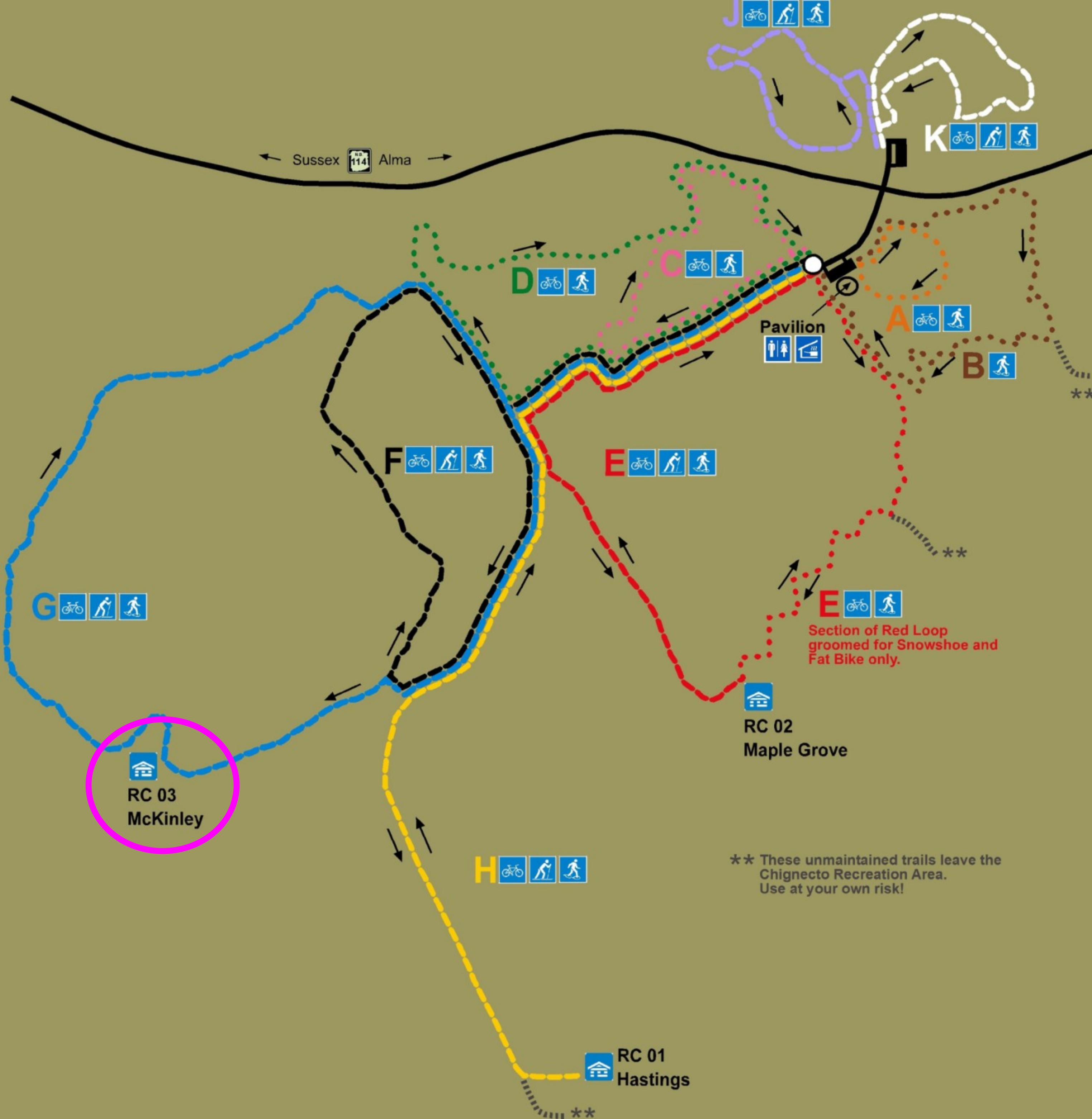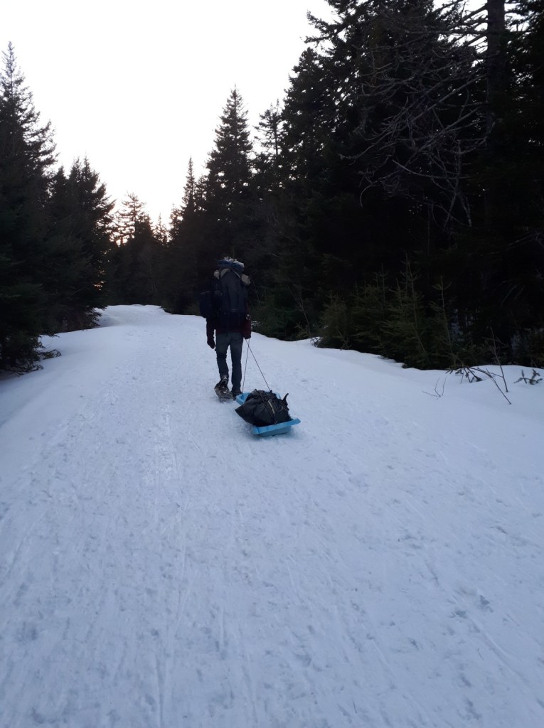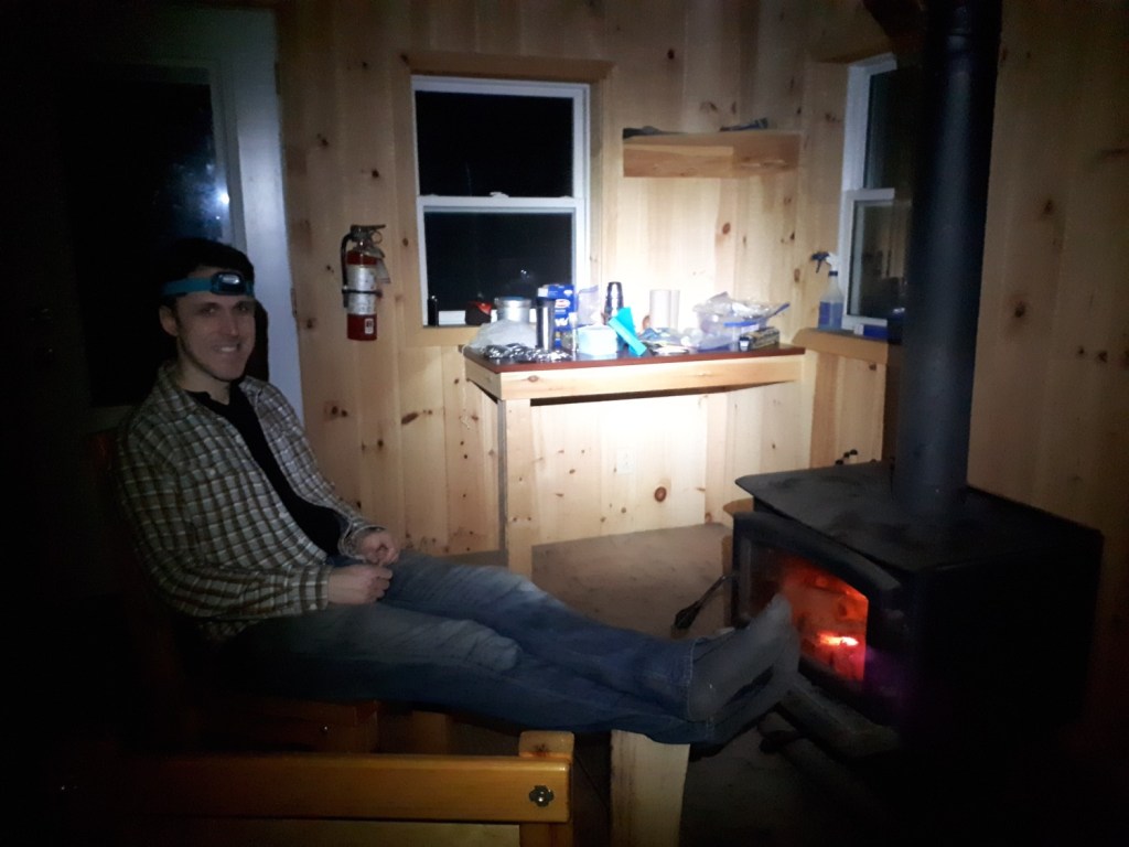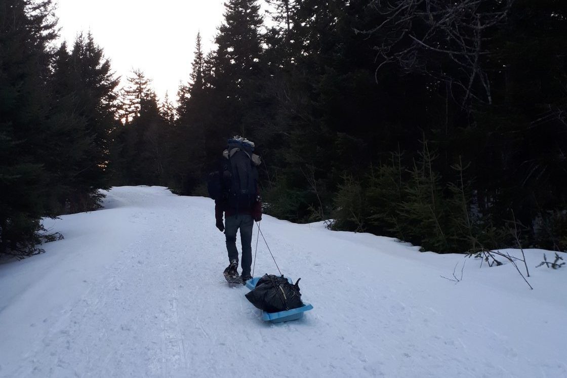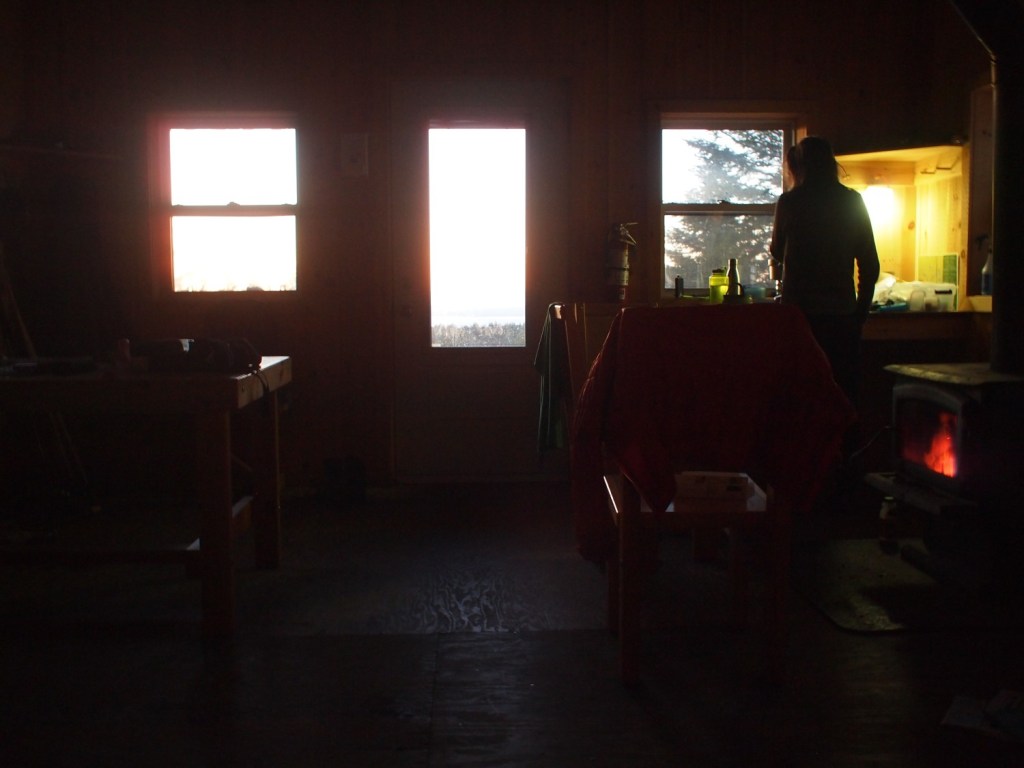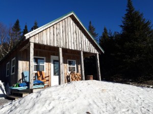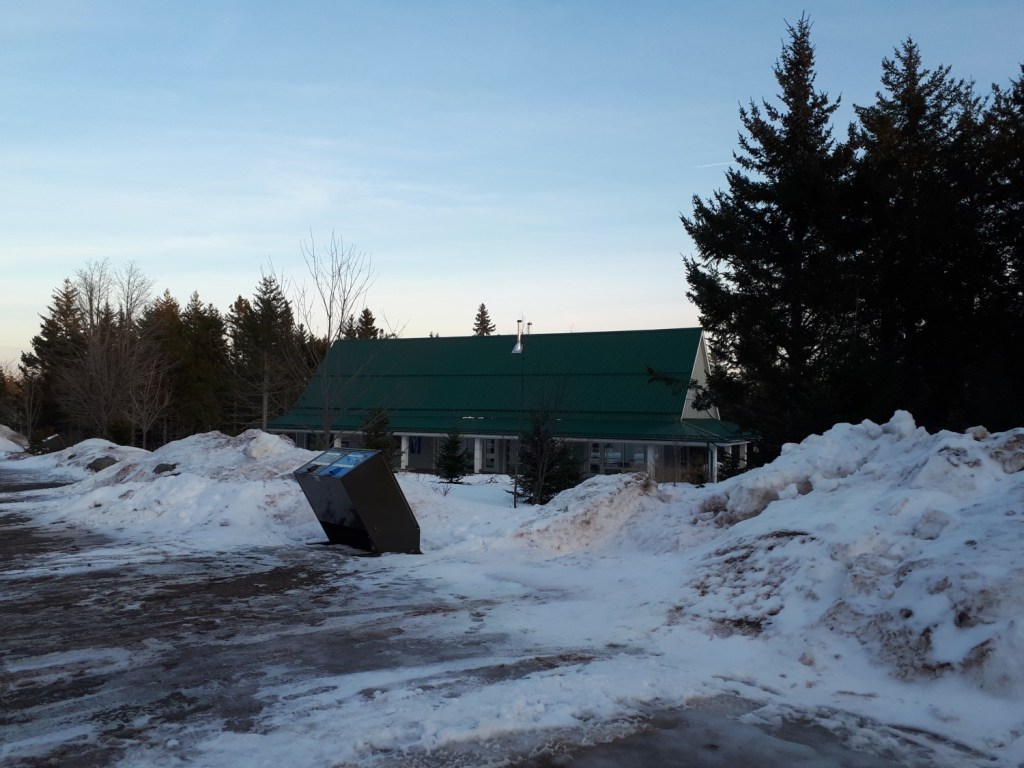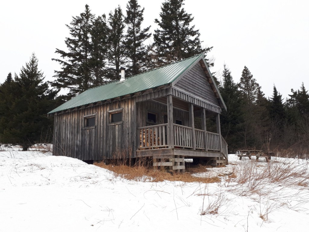 We stayed at the McKinley cabin (R03), which was located about 2 km from the parking lot for the Chignecto Recreation Area (see map). We used our hiking backpacks and a sled to transport our gear and 15+ L of water. We wore our snowshoes on the hard packed snow and it took us about an hour to make the trek.