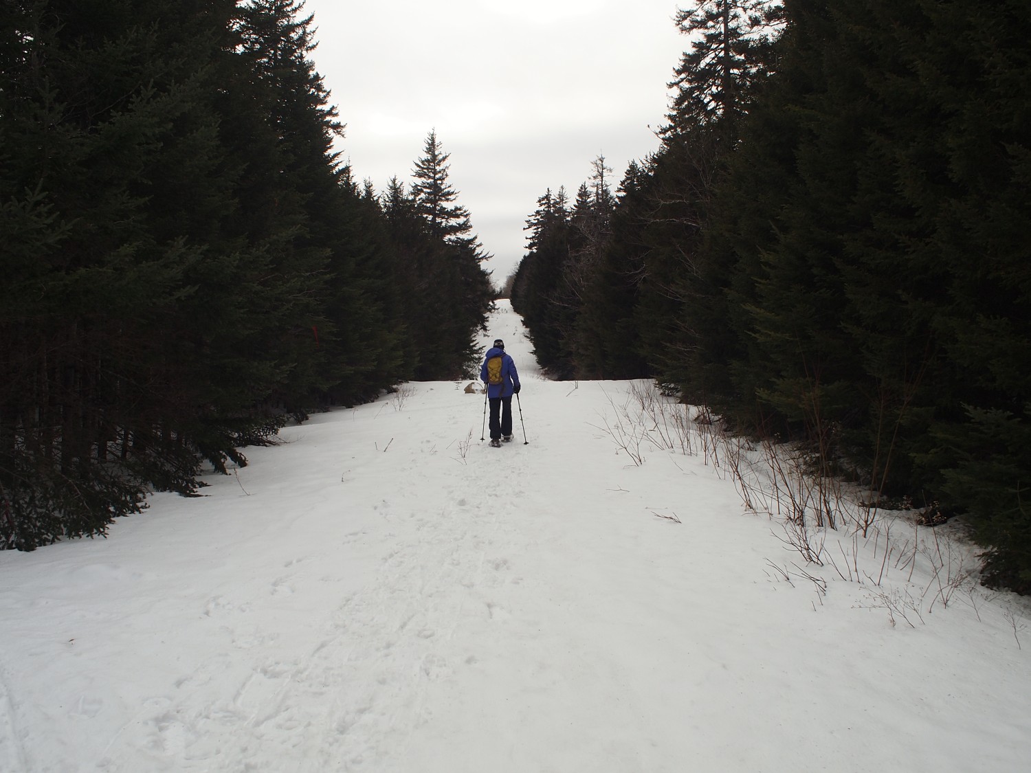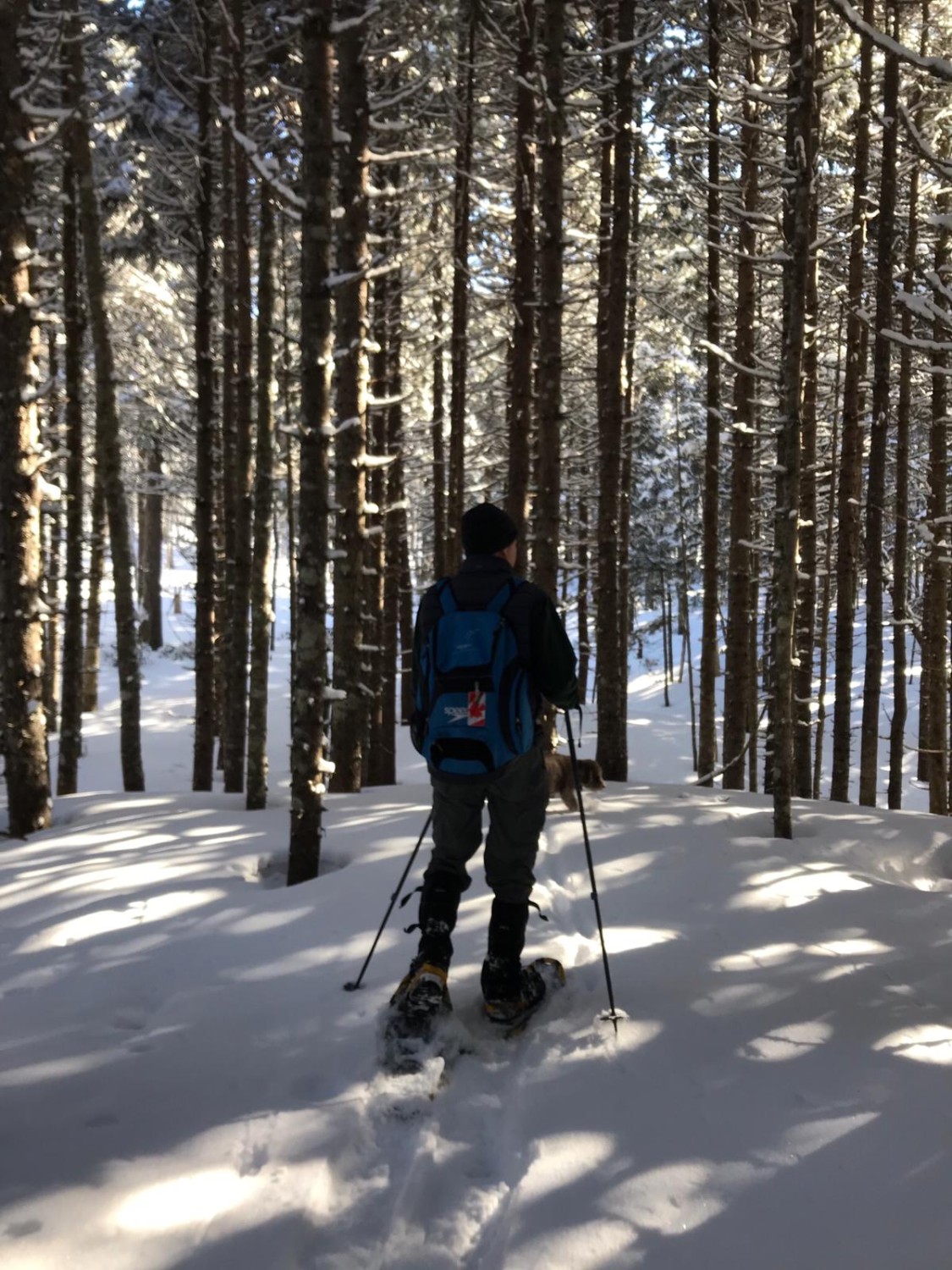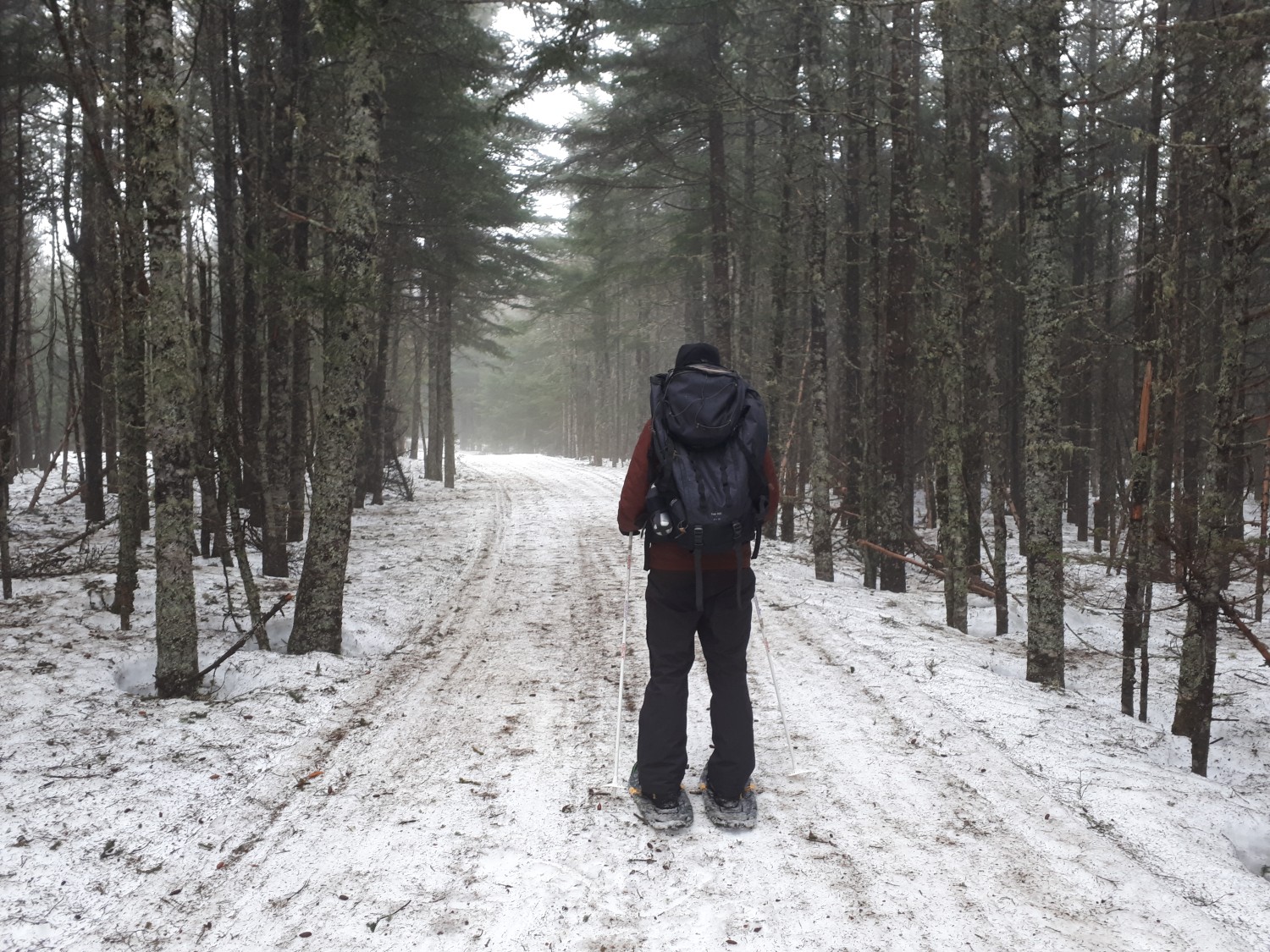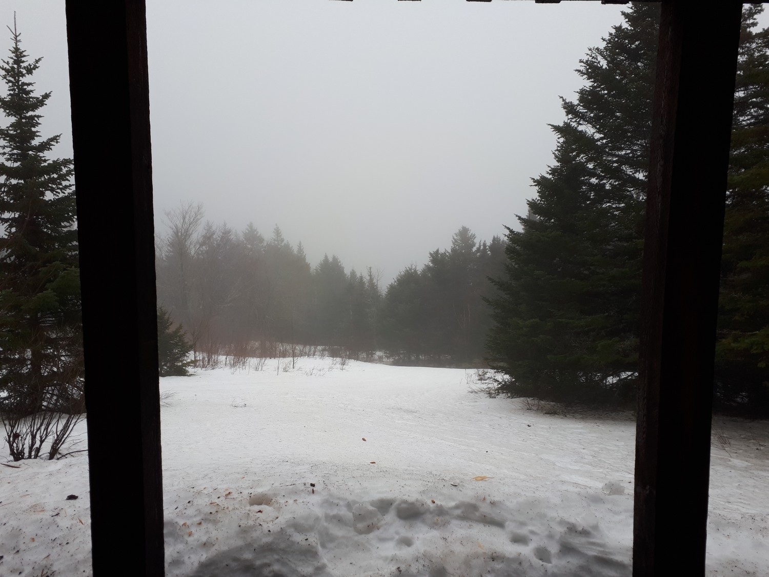 We brought both snowshoes and cross-country skis with us, but the hard-packed, slippery conditions meant that the skis stayed in the car this time. One day, we went for a 10+km snowshoe directly from our cabin, covering the blue, green, red and yellow trails. The next day — after 30mm of rain and many hours of reading our booked by the fire — we ventured out for a short misty walk.