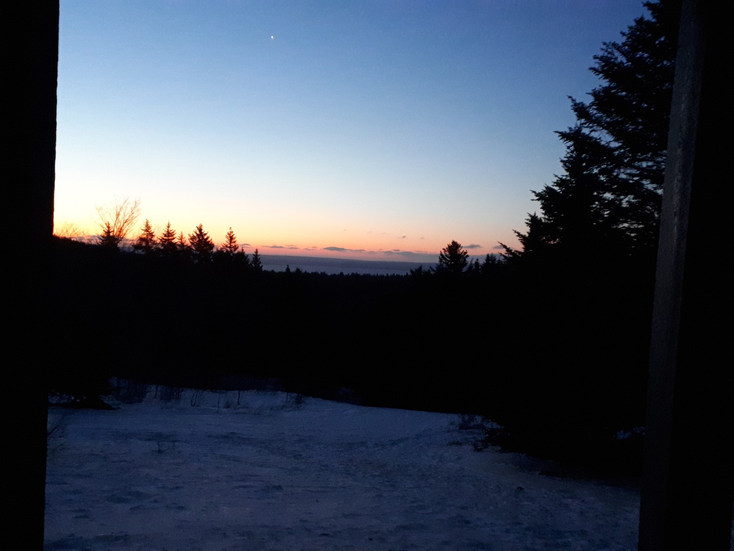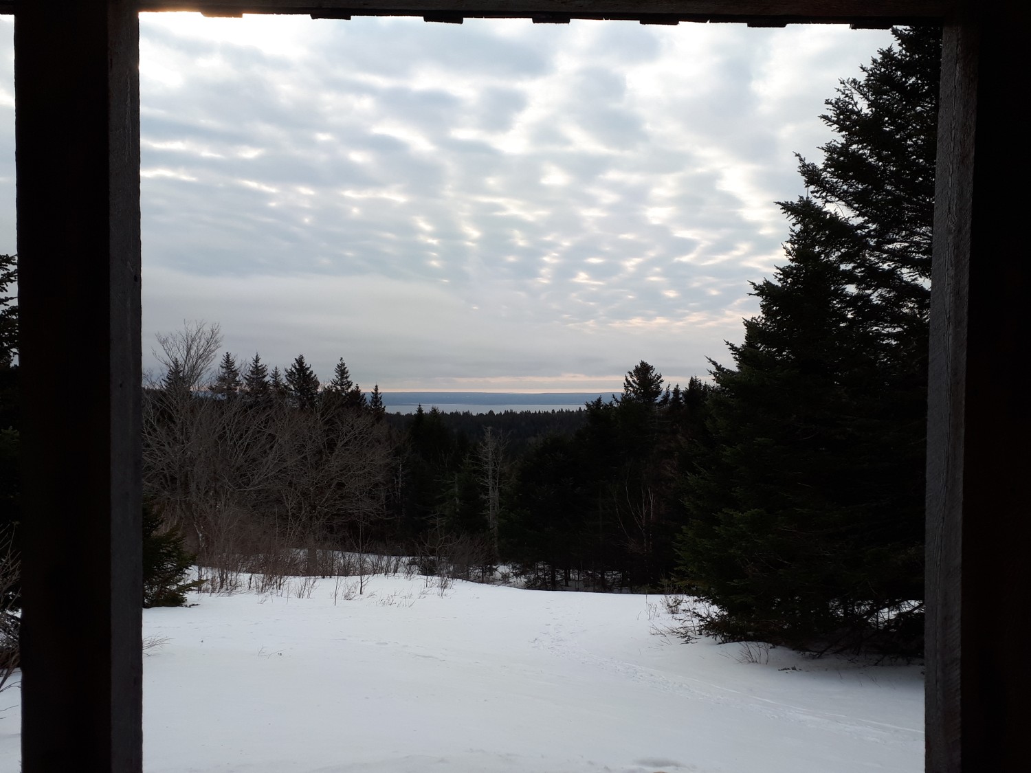 During our trip, we visited the other two cabins while out snowshoeing the trails. The Maple Grove and Hastings cabins are a few years older than the McKinley cabin, where we stayed. But, their outhouses were definitely more modern with solar panels powering a fan! All three cabins face south and have nice views of the Bay of Fundy, but the Hastings cabin has the largest windows so likely lets in the most light.