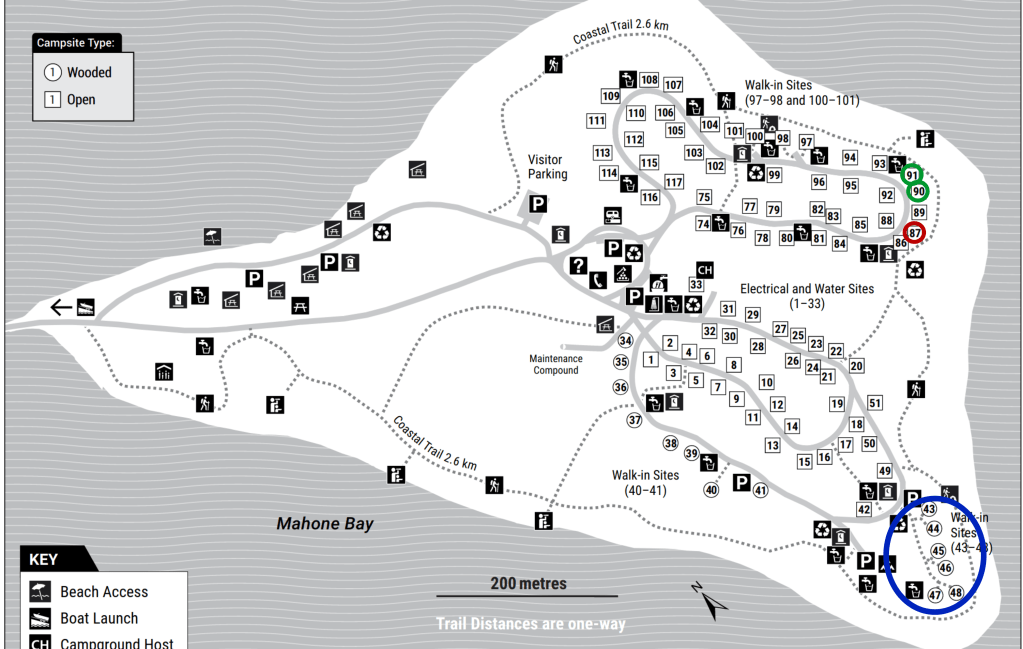 It was our first time spending the night at Graves Island Provincial Park. We lucked out on a last minute cancellation to be able to grab a spot on the September long weekend so we couldn’t be picky about our site. Site 87 turned out to be a nice site with a view of the ocean, but there were no trees big enough to support the hammock. For future reference Sites 90 and 91 looked to have some great hammock trees and the walk in sites provided the best views. The coastal trail around the outside of the island also had a few viewpoints. A friend saw a whale from here, but we weren’t so lucky when we went back.