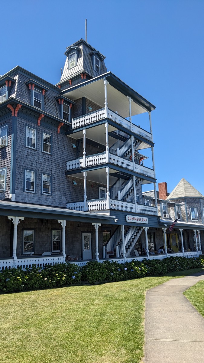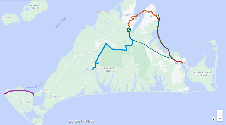 - Day 2: Biked from our campsite to Oak Bluffs to check out the Gingerbread Houses and Tabernacle. Then biked to Edgartown to have lunch and explore the town. We then caught the bus to Aquinnah to check out the beach and a coastal road. We took another bus to West Tidsbury and then biked back to our campsite via the State Forest Bike Trail.
