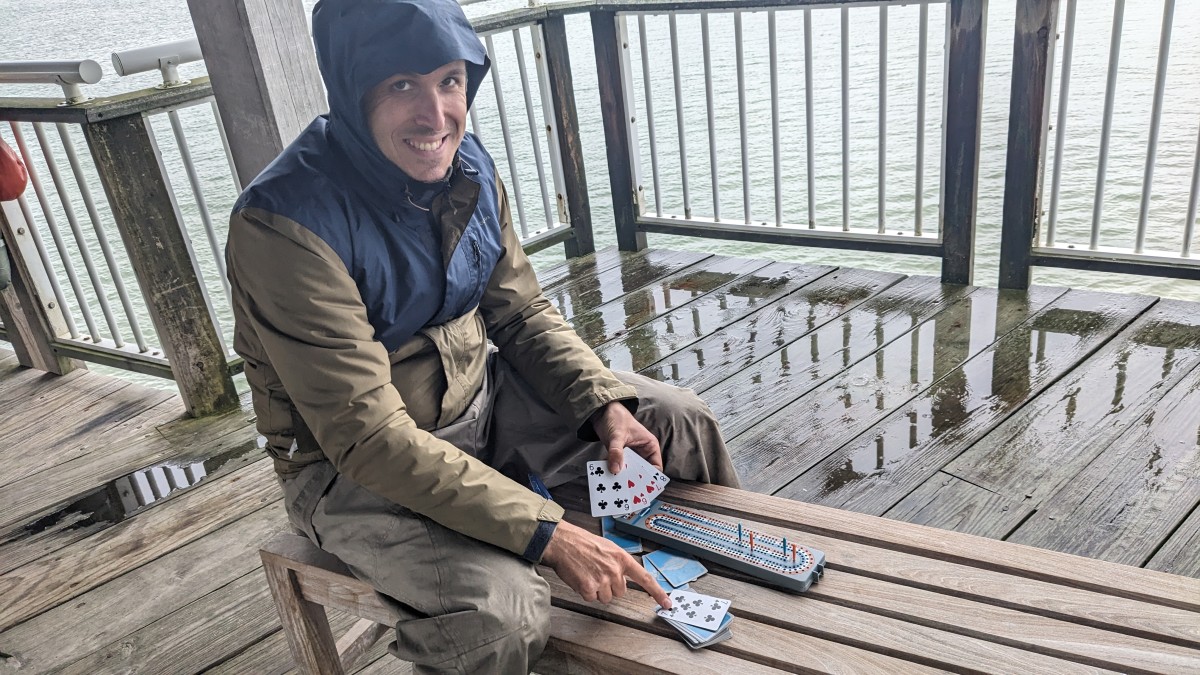 When we arrived in Oak Bluffs it was pouring, so we sheltered under the covered boardwalk for about an hour. We passed the time eating lunch and playing crib — Adrien won. We then decided to take the long way (18km) to reach Martha’s Vineyard Family Campground because we couldn’t check in until 3pm. We biked along Seaview Road and Beach Road on what was mostly a shared path. We then turned right onto Edgartown-Vineyward Haven Road and took the path the rest of the way to the campsite. The path was next to a main road, so it was a little noisy, but very nice that it was separated.