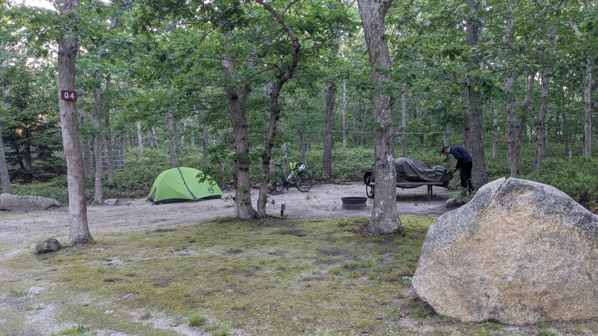 We spent two nights in this campground located south of Vineyard Haven. The cost was steep at $65 USD / night for a walk-in site, but it was the only campground on the island, so our options were limited. We were given campsite Q4, which was tucked in the woods, about 200m from the main area and the bathrooms. We were able to bike all the way to our site, but the ground was a bit sandy and pebbly in areas. It was nice and quiet in June and the fireflies came out at night!