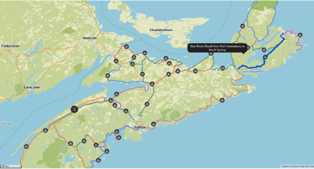 The Blue Route is a provincial cycling network in Nova Scotia that is under development. It aims to be a “continuous, comfortable, convenient cycling route network”. The map available at blueroute.ca/interactive-blue-route-map is not detailed enough to allow for easy route finding, so we’ve done our best effort to recreate the segments in common cycling applications.