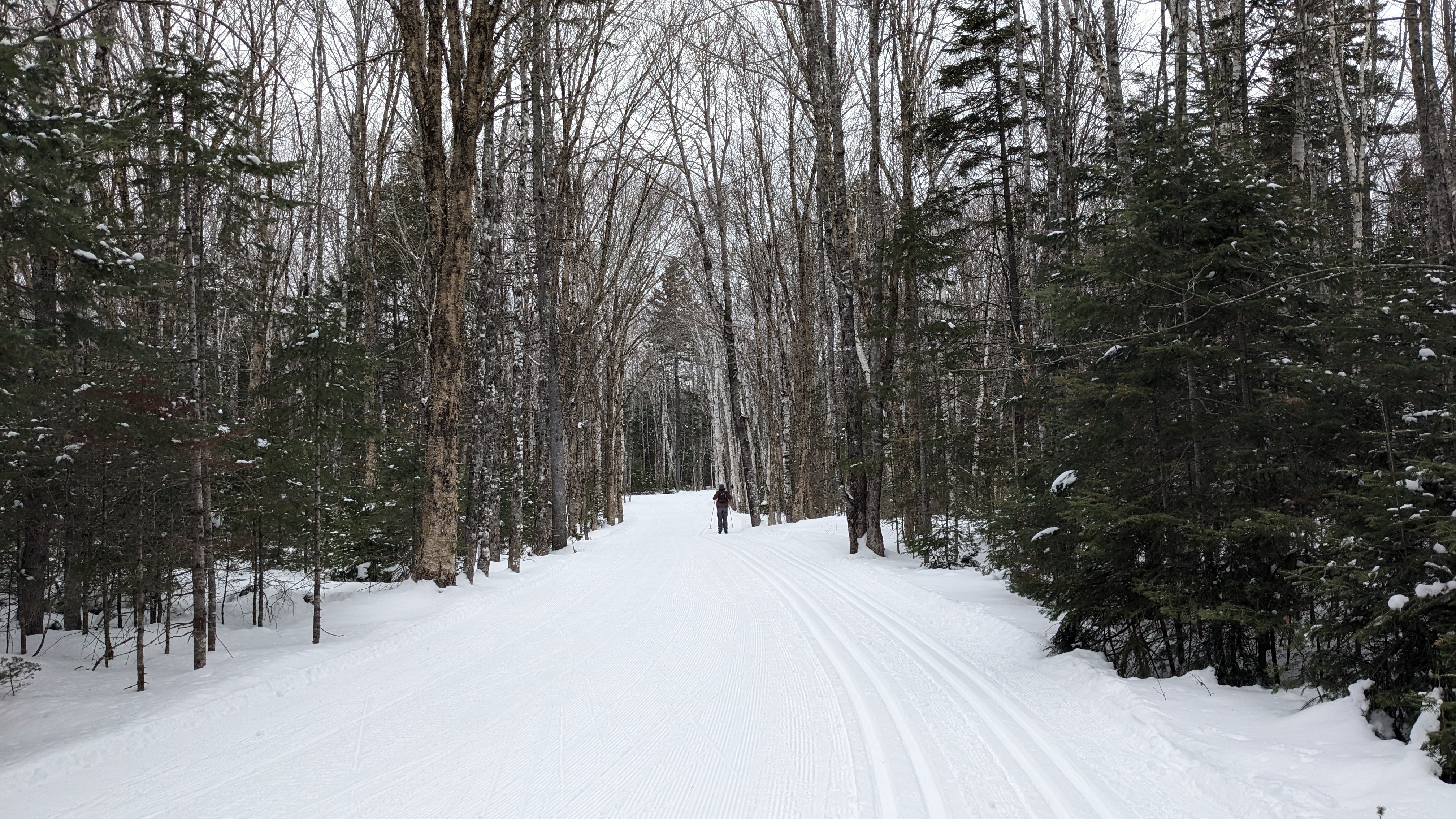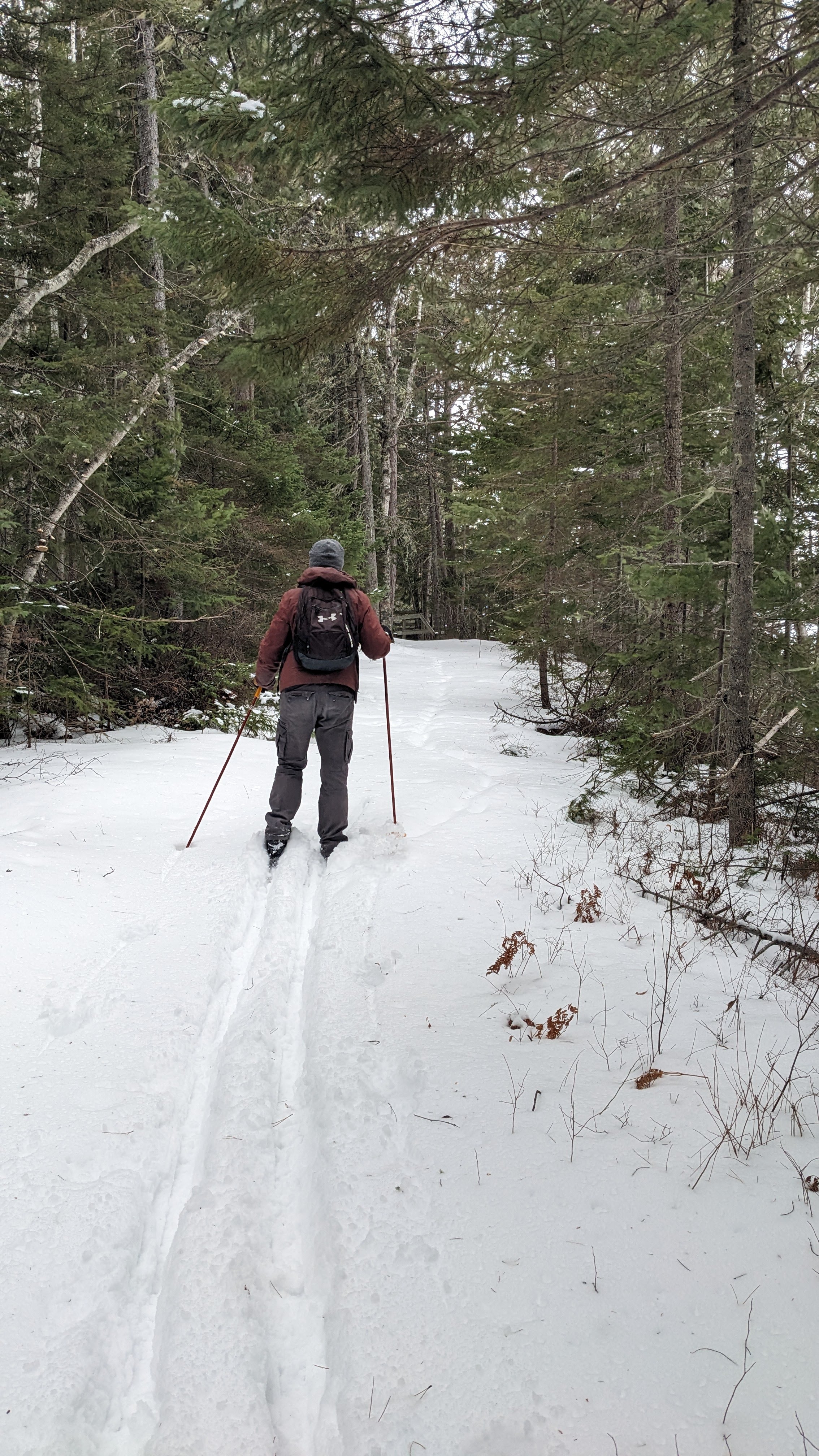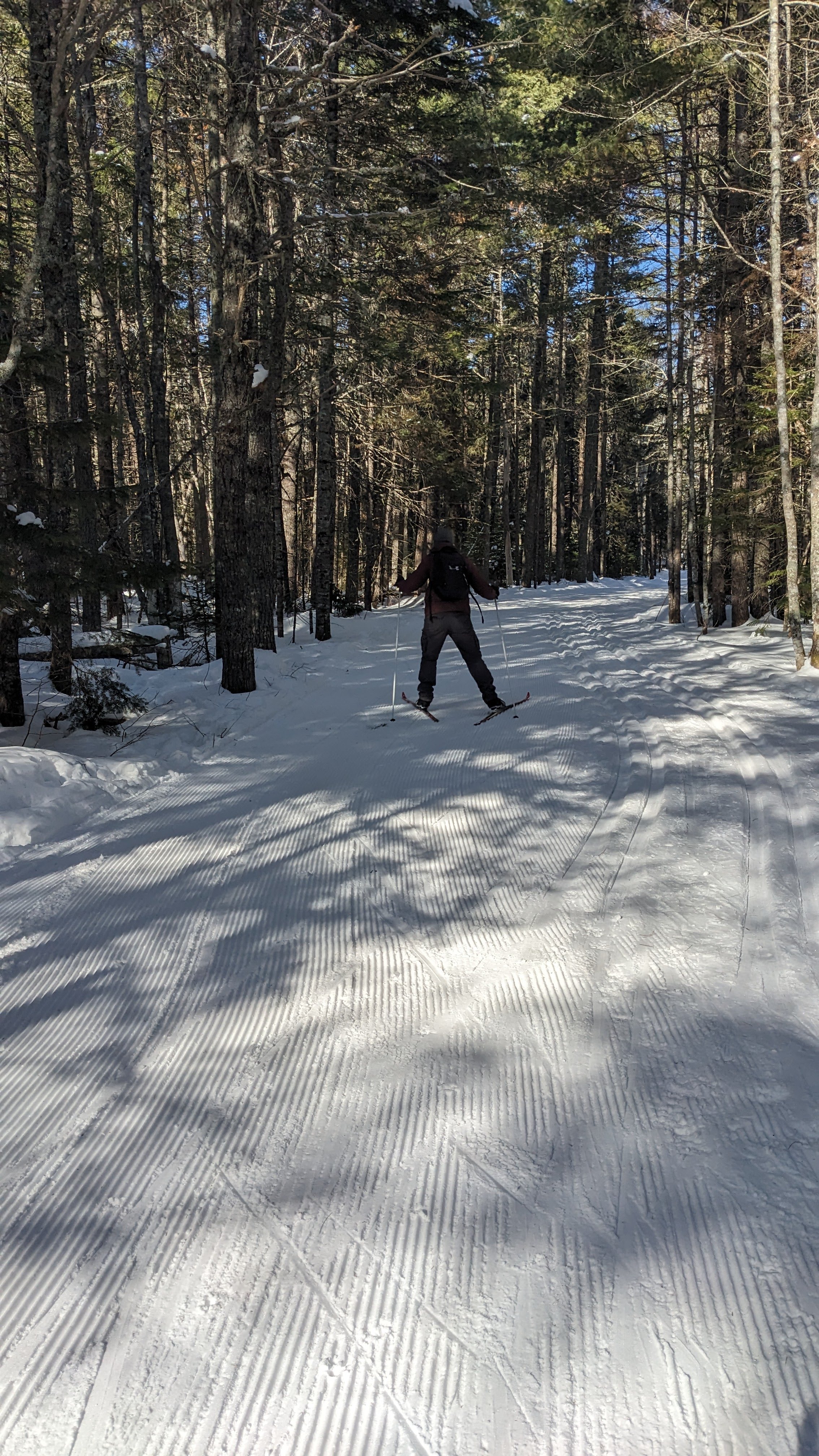 - The cross-country ski trails were very wide and pretty flat. #3 in the map above had some rolling hills that were quite challenging for us newbies on skate skis, but other than that everything was pretty gentle. It was a treat to have nearly perfectly groomed corduroy for skate skiing on all of the trails (1, 2, 3, 4 and 5) with classic tracks on 1-4. There was also a groomed extension beyond the rustic cabin at La Source to the South Kouchibouguac campground that isn’t indicated on the map. On our nordic skis, we also ventured off trail for a short distance to break up the monotony and get some river views. In total we did 20km of classic skiing in an afternoon and 9.3 km of skate skiing the next morning. The skate skiing was far harder physically, but we loved it and can’t wait to try again.