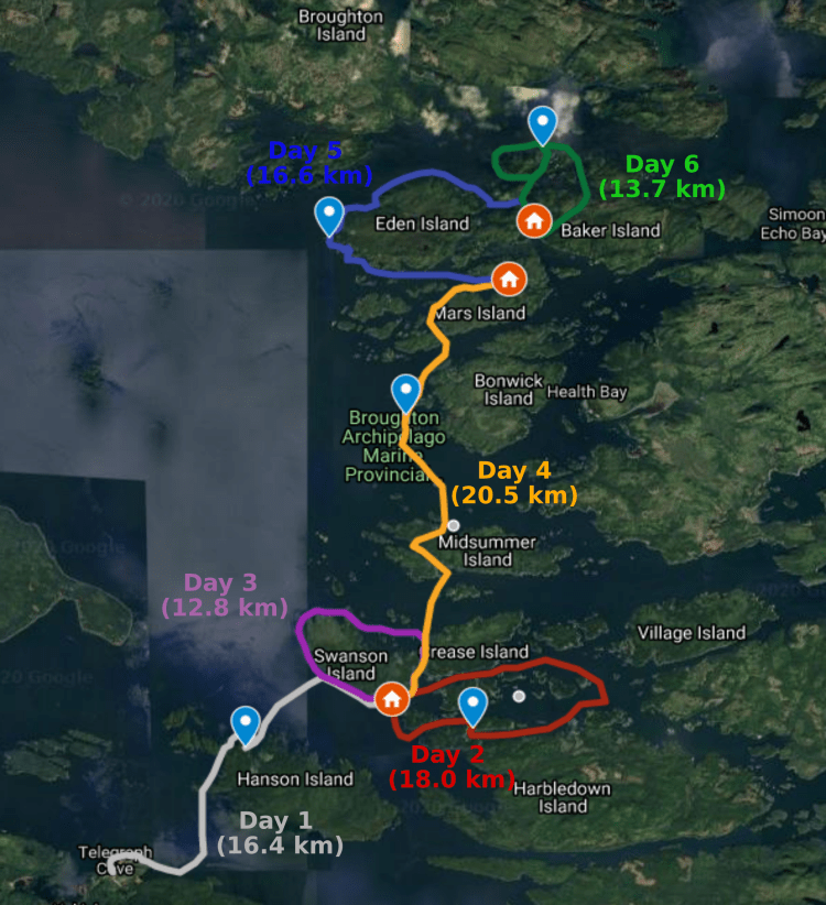 A six-day, 100 km, guided kayak tour through a group of islands to the north west of Vancouver Island. Smokey skies limited our exploration, but still an unforgettable trip!