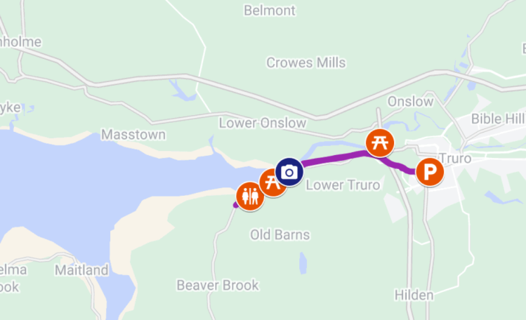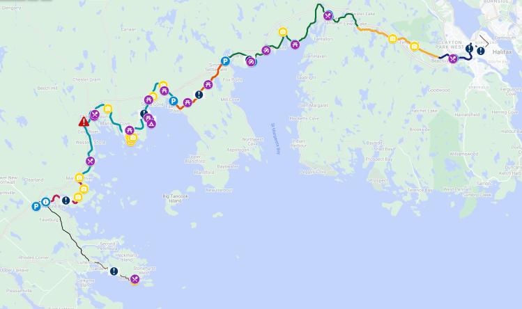 An 80 km route — mostly on multi-use trails — from Halifax to Meaghers Grant. We’ve mapped this out based on Google, but as we are learning — it may NOT all be passable by bike.